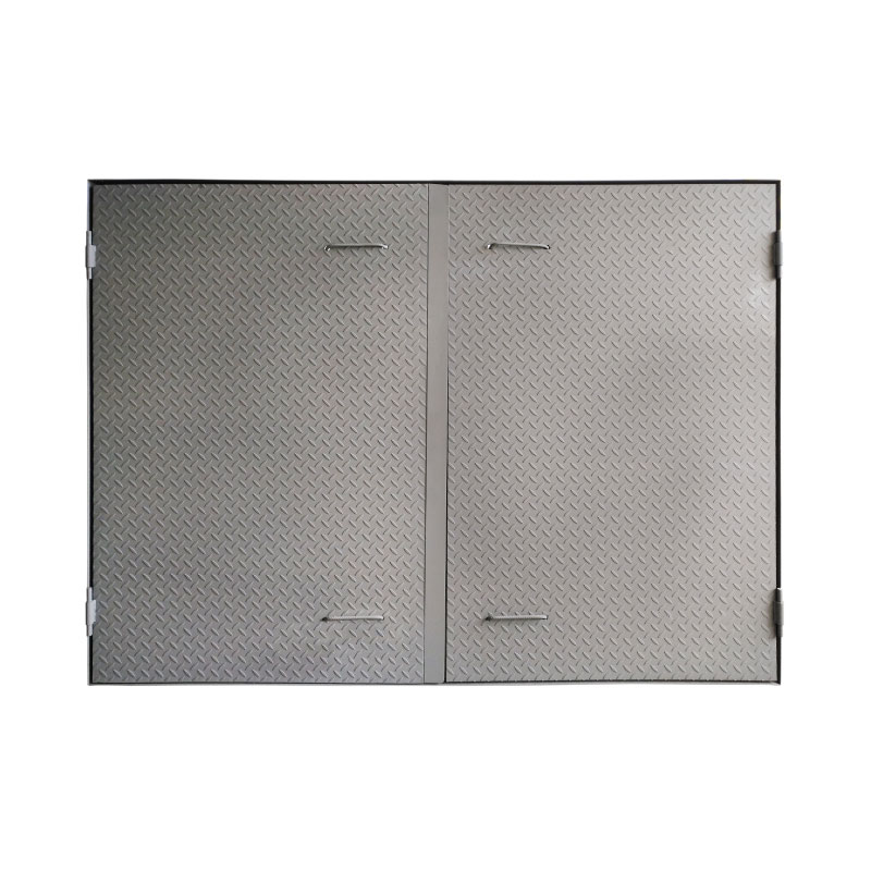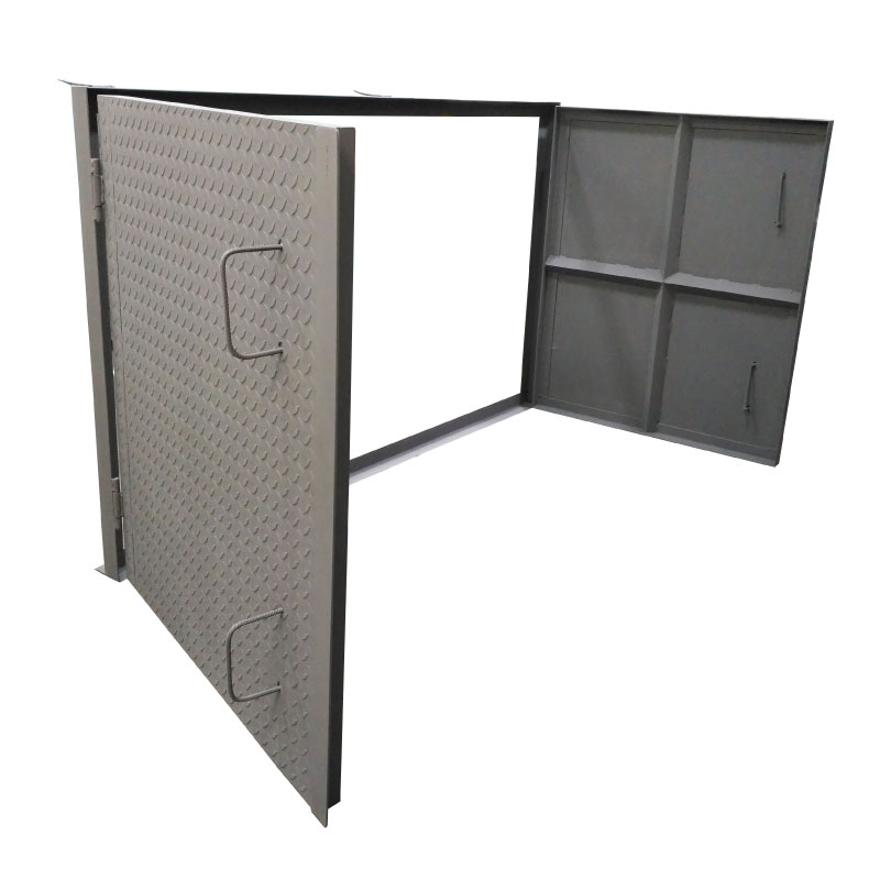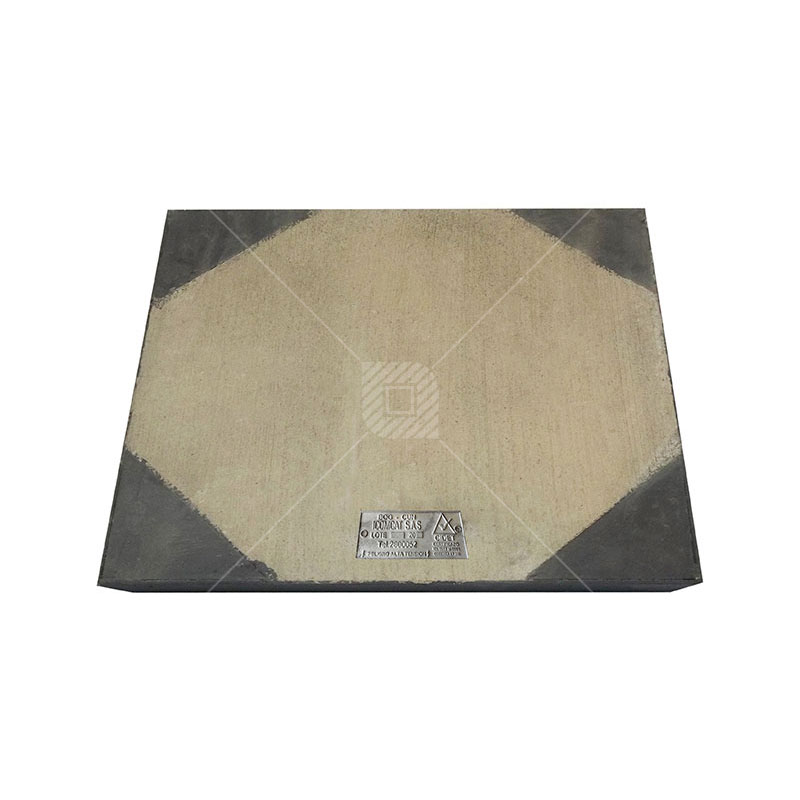 Tapa: Platina de hierro de 2 ½ x 3/16”, 17 varillas corrugadas de ½” con refuerzos esquineros y puntos de soldadura, 4 platinas triangulares de 3/16” x 200 mm de lado como protección en las esquinas y concreto a 4000 psi.