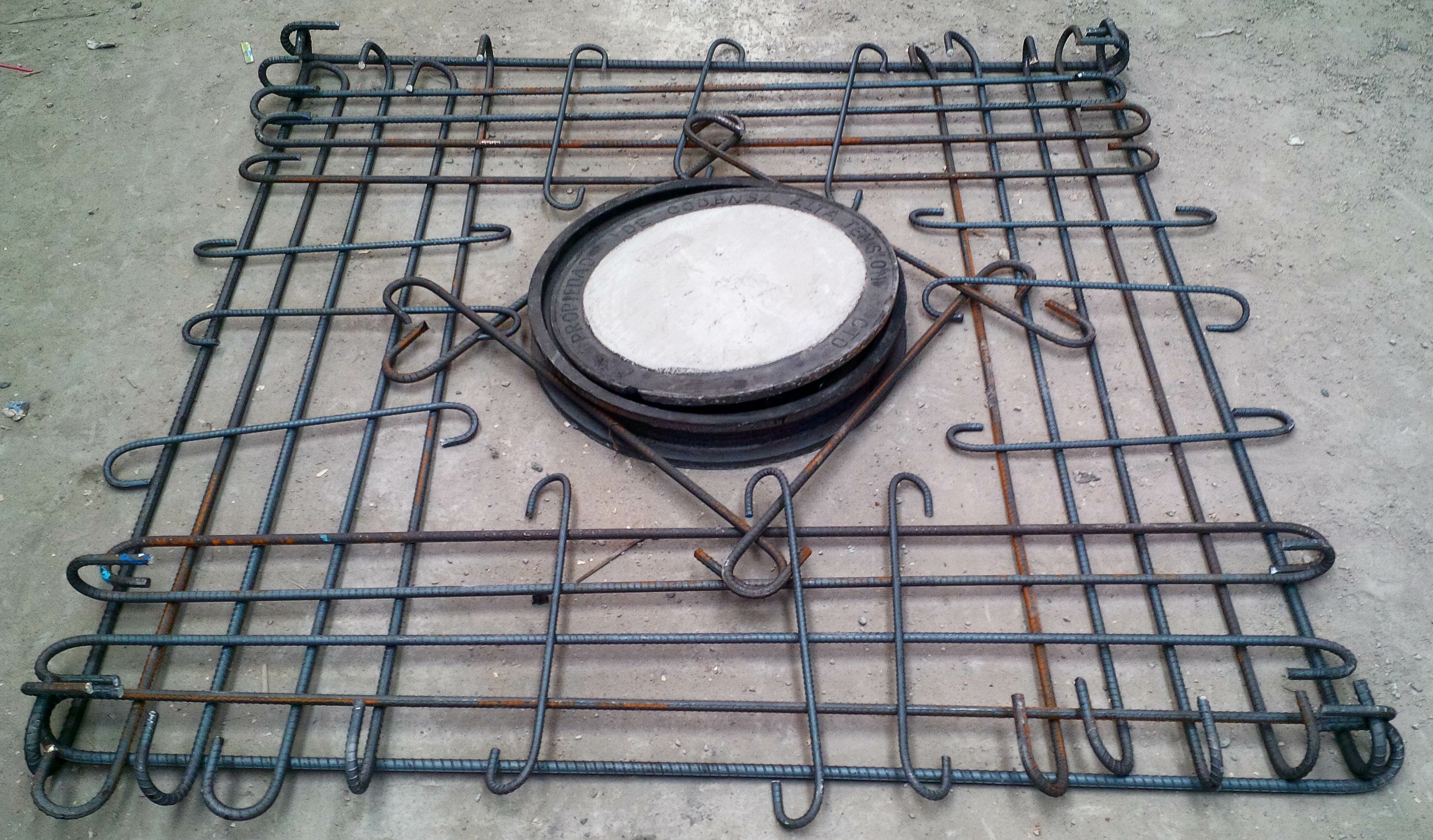Tapa: Platina de hierro de 2 ½ x 3/16”, 17 varillas corrugadas de ½” con refuerzos esquineros y puntos de soldadura, 4 platinas triangulares de 3/16” x 200 mm de lado como protección en las esquinas y concreto a 4000 psi.